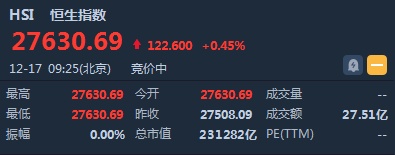 智通财经APP获悉,恒生指数开盘高开122.6点或0.45%,报27630.69点。国企指数涨0.44%,报10826.76点。红筹指数涨0.13%,报4398.12点。大市盘前成交27.52亿港元。