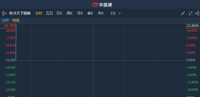 智通财经APP获悉,有才天下猎聘(06100)市前现一宗大手成交,每股作价18.93元,涉及1167.42万股,涉资2.21亿元。截至9时30分,涨22.86%,报价18.7港元,成交额2.211亿。