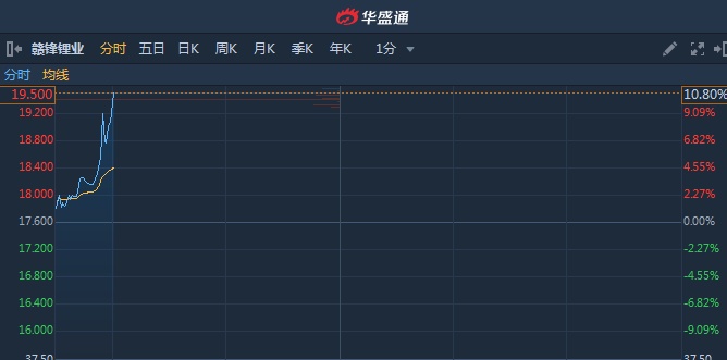 智通财经APP获悉,赣锋锂业(01772)早盘A股急升涨停,H股跟涨,截至10时00分,涨10.57%,报价19.46港元,成交额6905万。