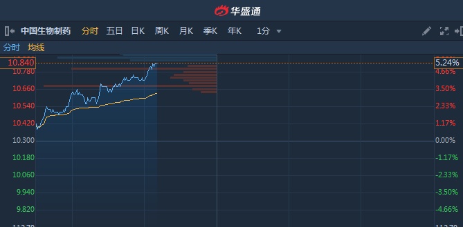智通财经APP获悉,中国生物制药(01177)昨日盘后发布公告称,抗癌药“注射用硼替佐米”获药品补充申请批件。盘中股价持续攀升,截至11时09分,涨5.05%,报价10.82港元,成交额2.824亿。
