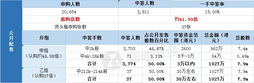 其中,公开配售申购人数20654,一手中签率15%,超购倍数约41.99倍。