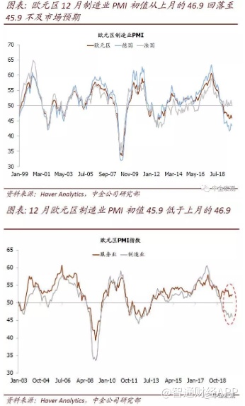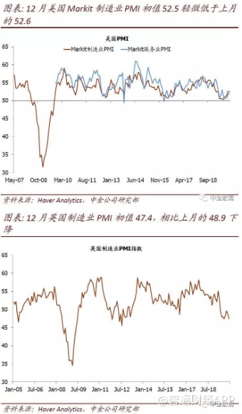 欧元区内部,制造业依然偏弱,但尚未传染至服务业。欧元区12月制造业PMI指数从上月的46.9回落至45.9,逆转此前连续两个月改善的趋势;不过目前为止欧元区服务业受制造业拖累还不明显,12月服务业从上月的51.9小幅上升至52.4。鉴于制造业对欧元区的重要性,其持续处于收缩区间,通过对就业、消费者信心的负面冲击,均可能向服务业传导。因而,现在欧元区一个重要风险点就是制造业如果过久处于收缩区间,可能向服务业传染。后续尤其需继续关注欧元区就业市场情况。