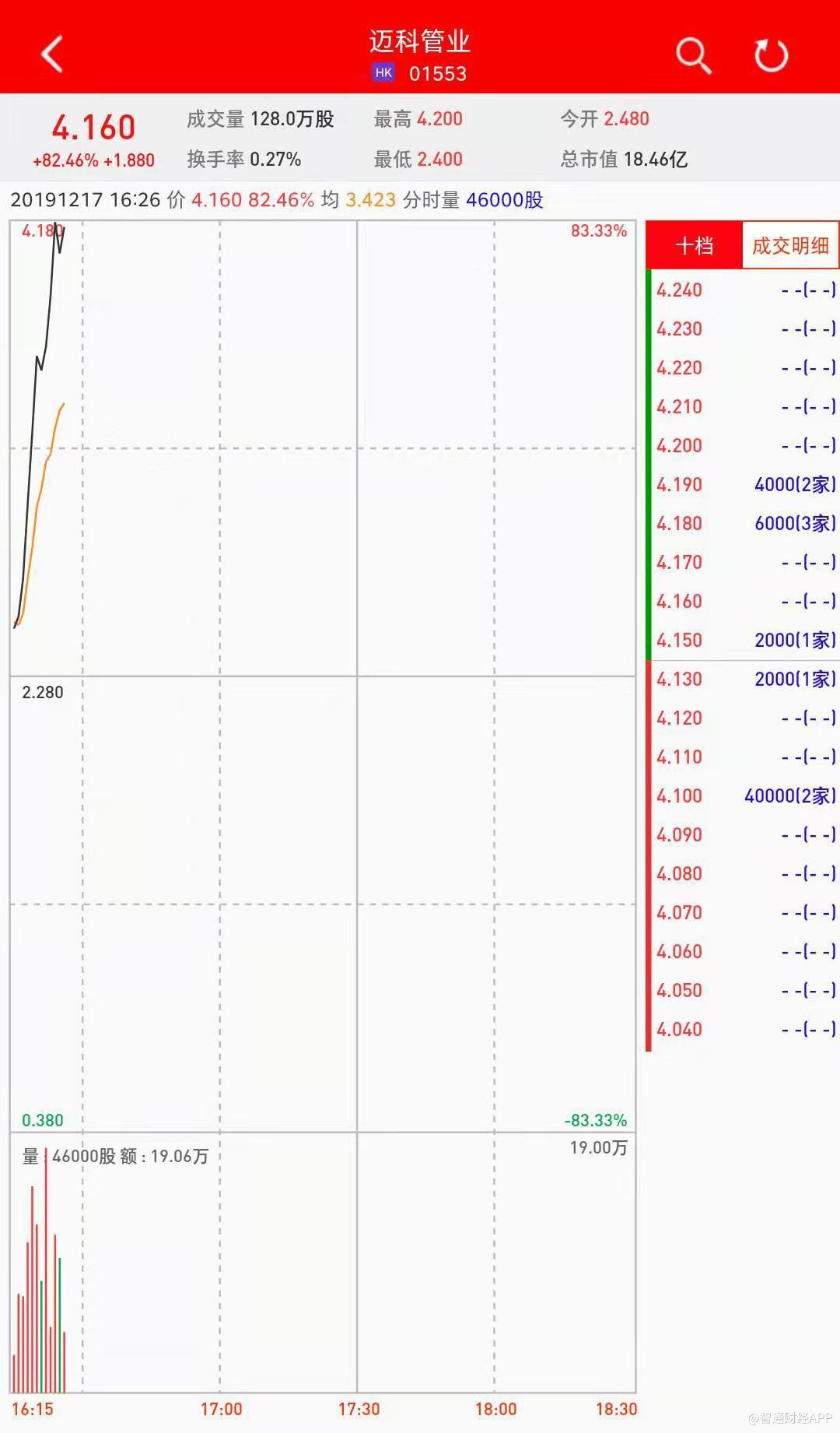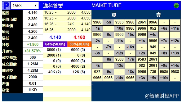 智通财经APP获悉,迈科管业(01553)将于12月18日挂牌,今日暗盘高开,截止到发稿,辉立证券暗盘交易显示其报价4.14港元,较招股价2.28港元涨81.579%。每手2000股,不计手续费,每手赚3720港元。