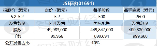 智通财经APP获悉,12月17日,JS环球(01691)配售结束。配售招股价5.2-5.2港元,最终定价5.2港元,每手2600港元。