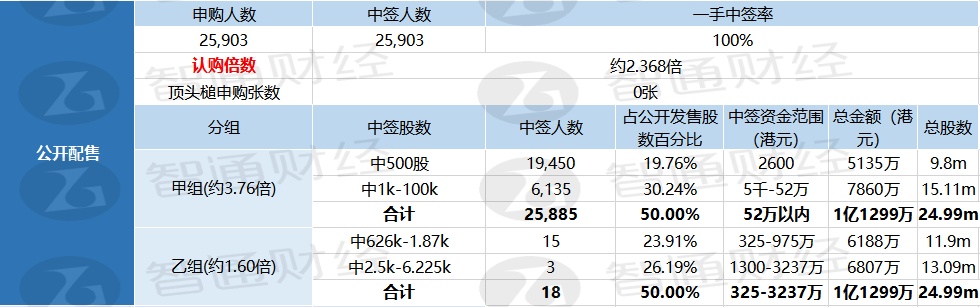 其中,公开配售申购人数25903,一手中签率100%,认购倍数约2.368倍。
