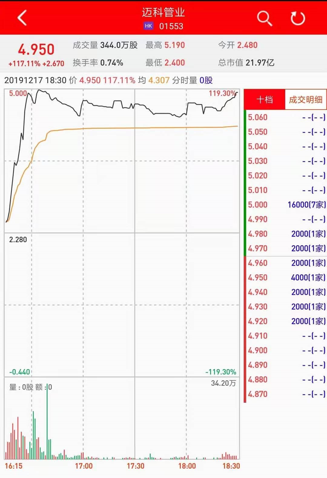 智通财经APP获悉,迈科管业(01553)将于12月18日挂牌,截至收盘,辉立证券暗盘交易显示其报价4.96港元,较招股价2.28港元涨117.11%。每手2000股,不计手续费,每手赚5360港元。