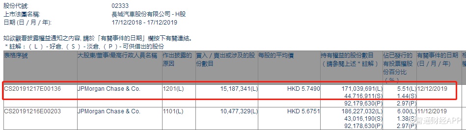 智通财经APP获悉,联交所最新资料显示,12月12日,摩根大通减持长城汽车(02333)1518.73万股,每股作价5.749港元,总金额约为8731.18万港元。减持后最新持股数目约为1.71亿股,最新持股比例为5.51%。