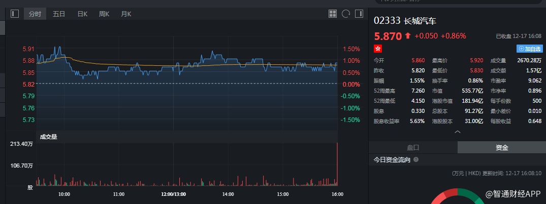 截至今日收盘,长城汽车涨0.86%,报5.87港元。