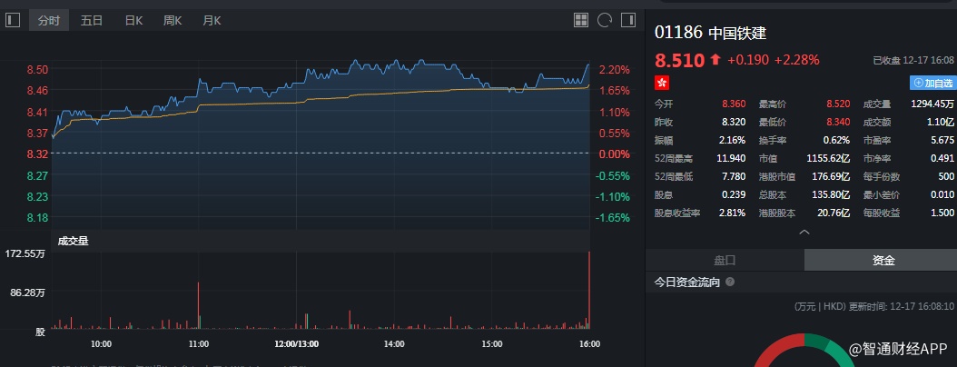 截至今日收盘,中国铁建涨2.28%,报8.51港元。