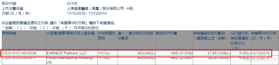 智通财经APP获悉,联交所最新资料显示,复星医药(02196)获EARNEST Partners,