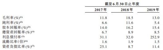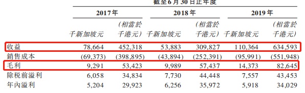 截至2017年、2018年及2019年6月30日止年度,整体毛利分别为929.1万新加坡元,998.9万新加坡元,1437.3万新加坡元。整体毛利率分别约为11.8%、18.5%及 13.0%。纯利率分别为6.6%、11.6%及5.4%。