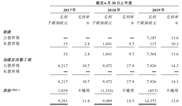 光荣建筑收益由截至2017年6月30日止年度约7866.4万新加坡元减少至截至2018年6月30日止年度约5388.3万新加坡元,主要受加建及改动项目的收益减少影响。收益增加至截至2019年6月30日止年度约1.10亿新加坡元,主要受在公营界别新建及加建及改动项目的收益增加影响。