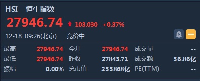 智通财经APP获悉,恒生指数开盘涨103.3点或0.37%,报27946.74点。国企指数涨0.47%,报11016.87点。红筹指数涨0.35%,报4439.82点。大市盘前成交36.87亿港元。