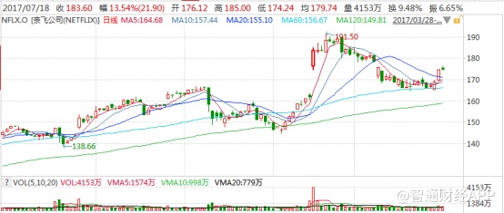 凭借着优质内容,2017年2季度,奈飞宣布其订阅用户首次突破1亿大关,增至1.04亿。此时公司股价达到每股191.5美元,市值突破800亿美元。