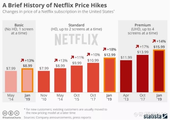 奈飞之所以能成长为一家市值高达1300亿美元的流媒体行业龙头,在于其找到了一条估值增长的可行通路:持续增加订阅用户数,并不断提高付费标准。