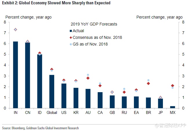 一年前,高盛曾预测全球经济增长将从2017-2018年的3.8%放缓至2019年的3.5%,主要有两个原因:1、美国减少了财政刺激;2、金融环境收紧。