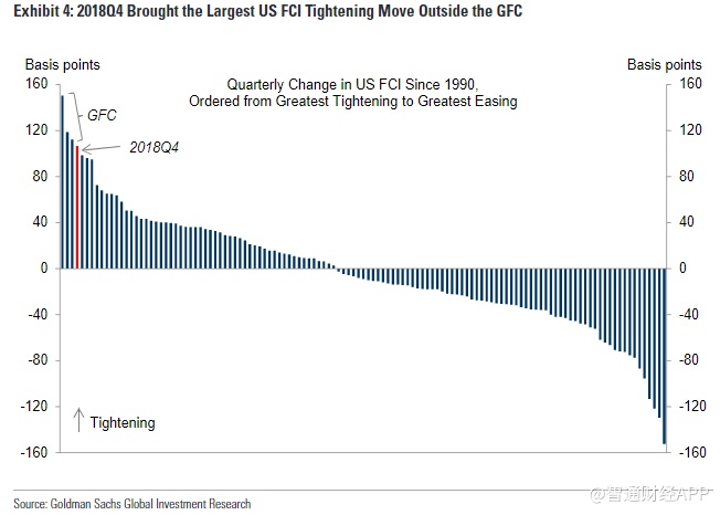 自2018年四季度起,受到欧洲等国家经济数据的负面影响、以及美联储鹰派的政策冲击,引发全球分线资产的大幅抛售。10月初,美联储主席鲍威尔“偏鹰派”的发言证明了这一点。高盛的美国金融形势指数(FCI)显示,2018年Q4是除金融危机之外,收紧力度最大的一个季度,达到100个基点。