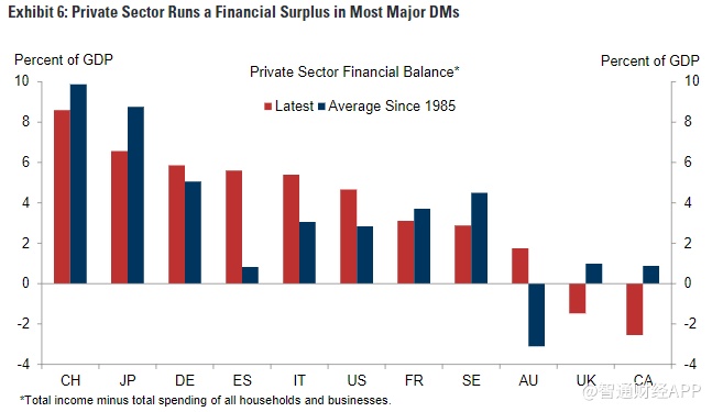 而支撑高盛维持相对乐观的看法更广泛的原因是,从私营部门的财务平衡水平来看,大多数发达经济提的家庭和企业的财务状况都非常好。如下图所示,几乎所有世界主要经济体的私营部门都有相当大的财政盈余,大致与长期平均水平相当,这在之前的长期扩张阶段是不常见的。而目前美国以及其它经济体正经历有史以来最长的扩张期,私营部门盈余是一个好的信号。