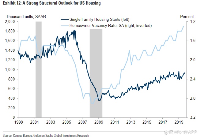 高盛认为,美国经济正在改善,原因有三。首先,在经历了2018年和2019年初的放缓之后,抵押贷款利率的大幅下降为房地产市场复苏注入了活力。房地产的结构性前景仍然强劲,因为建筑活动水平仍然远远低于人口需求,而且按季节调整后的房屋空置率现已降至38年来的最低水平。