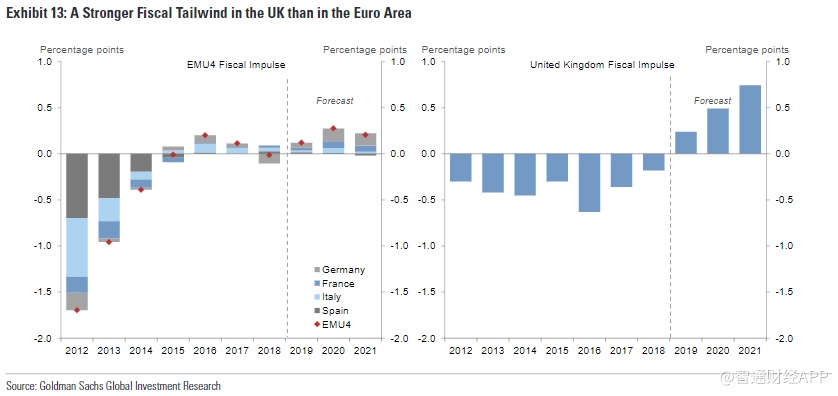 从国家层面上看,高盛称对美国经济增长将逐步改善的信心最高,因为美国的需求对金融状况最为敏感。至于英国,预计脱欧的阻力将会出现逆转,财政政策也会偏向宽松;欧洲和日本的经济增长会更为缓慢,因为欧洲的财政刺激措施依旧有限,而日本的经济增长可能会因10月份消费税上调而出现负面影响。