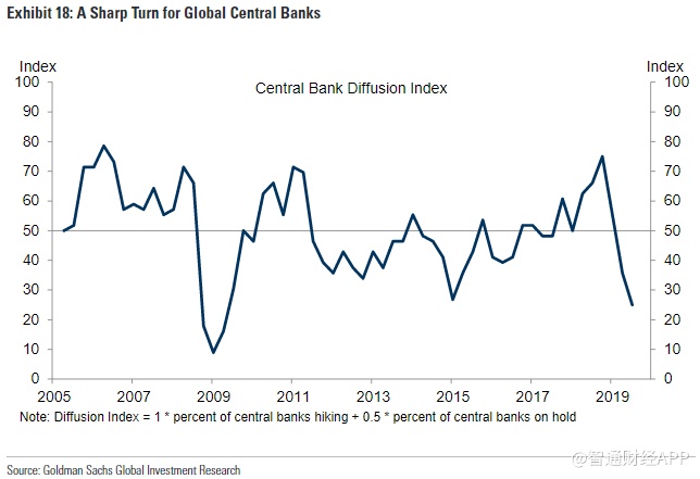 过去一年,货币政策的转变比高盛预期的要温和得多,美联储官员从2018年全年的加息转向过去3个月降息75个基点。其他国家的央行也纷纷效仿,尤其是在新兴市场。下图显示了全球央行自全球金融危机以来经历的最剧烈转变。