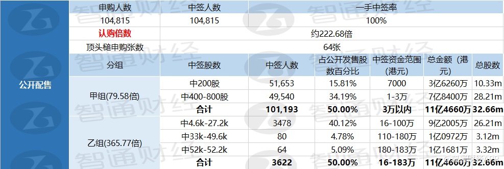 其中,公开配售申购人数104815,一手中签率100%,认购倍数约222.68倍。