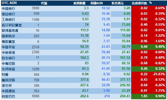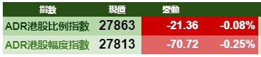 智通财经APP获悉,12月19日,美股三大指数小幅震荡,港股ADR指数全日微跌,按比例计算,收报27863点,跌21.36点或0.08%。大型蓝筹涨跌不一,汇丰控股收报60.79元,较港收市升0.19元;腾讯控股收报377.17元,较港收市跌0.43元。