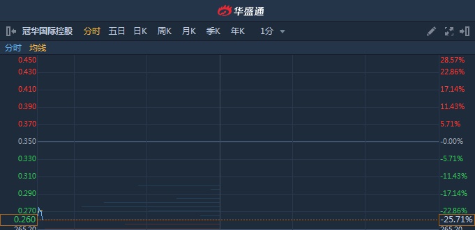 智通财经APP获悉,冠华国际控股(00539)拟“1供2”基准折让22.86%供股,净筹4.125亿港元。早盘股价遭重挫,暂居跌幅榜首位,截至9时34分,跌25.71%,报价0.26港元,成交额153.3万。
