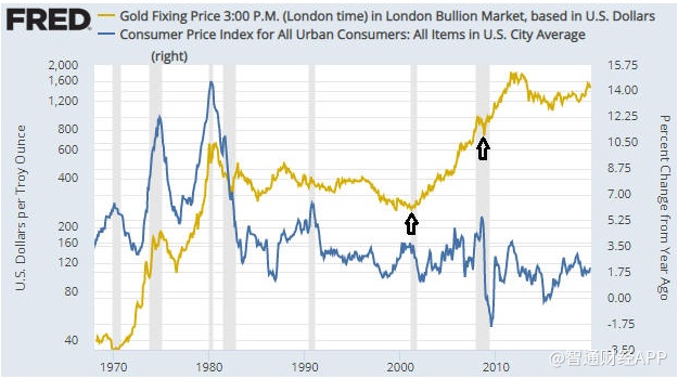 然而,在接下来的37年间,这种正相关性并没有延续下去。尤其是在2001年初以及2008年底,这两次金价的上涨与所谓的“CPI通胀”毫无关系。
