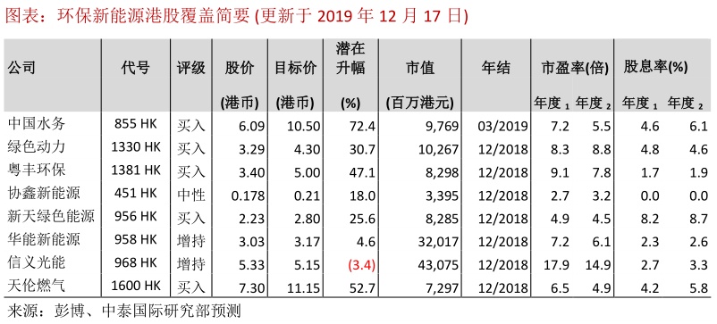 展望2020年,我们细分环保新能源板块,评审政策风险及行业增长两大因素后,作出以下行业投资优先次序:天然气分销>风电>光伏>供水>环保。天然气分销是我们的首选行业,因为(一)中俄东线天然气管道投产通气;(二)国家石油天然气管网集团有限公司正式成立一起加强气源供应,并从而支持中国天然气消耗量增加。