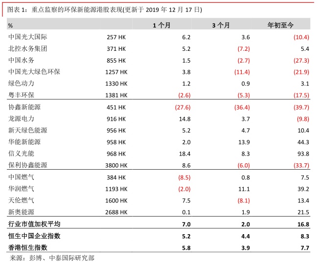 我们去年对环保新能源港股板块2019年投资策略之预测整体上正确。我们于2018年12月14日发表《2019年环保新能源行业投资策略》,列出2019年看好板块次序:天然气分销>风电>光伏>环保。我们提出了两大预测方向:(一)最看好天然气分销板块,主要因为天然气需求持续增长及中央利好政策支持;(二)环保板块则表现相对最差,因为行业利好因素早已被反映。