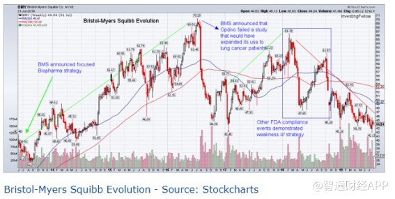 该战略旨在剥离非核心业务,专注于研发肿瘤药品和现金牛产品(例如于辉瑞合作的艾乐妥)。消息宣布后,股价立即出现上升趋势。不幸的是,公司在2016年8月宣布纳武单抗(Opdivo)的一项研究失败(相比较,默克公司(MRK.US)的同一项研究结果向好),而如果该项研究成功,此药物就可以扩大其适用范围到肺癌领域。最终,股价产生大幅波动和调整,公司未能贯彻执行预先计划,以收购新基生物制药(Celgene)为此次战略调整之路画上句号。