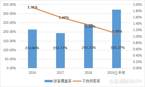 从趋势上来看,近年来贵州银行的整体资产质量持续向好,且不良处于下行通道。2016-2018年及2019上半年,贵州银行不良贷款率分别为1.91%、1.60%、1.36%和1.09%,拨备覆盖率为212.86%、192.77%、243.72%和323.27%,拨贷比为别为4.07%、3.09%、3.31%和3.52%,均满足中国银保监会的监管要求且高于业内大多数银行。