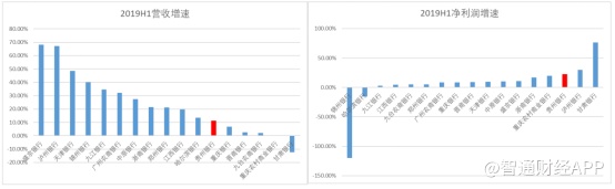 有意思的是,在2019年上半年的净利润增速方面,却有多家银行表现出与高营收增速相反的状态,比如盛京银行、天津银行等,营业收入增速虽保持较高水平,但净利润增速仅为个位数,二者相差过大,经营的稳健性有待持续观察。反观贵州银行,营收增速虽不起眼,但却是保持在一个比较平稳的增速上,没有大起大落,稳健的营收增速带来净利润的高增长。