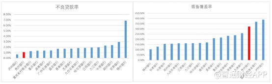 再看资产质量方面,截止2019年6月30日,赴港上市内地城商行平均不良贷款率为2.03%,平均拨备覆盖率为212.66%,通过以下两张柱状图,可以很明显的看出贵州银行的不良贷款率和拨备覆盖率均处于第一梯队,即使是同A股城商行相比也处于较好水平。