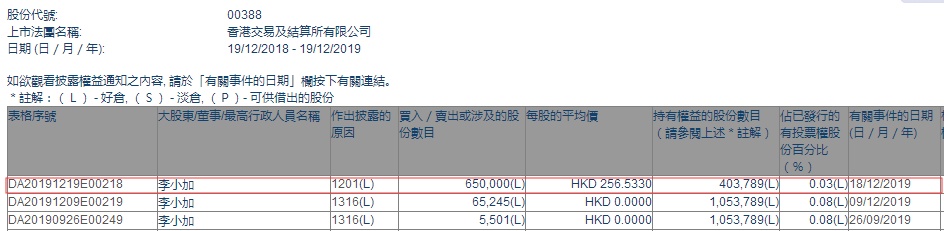 智通财经APP获悉,联交所最新资料显示,12月18日,港交所行政总裁李小加减持香港交易所(00388)约65万股,每股作价256.533港元,总金额约为1.67亿港元。减持后最新持股数目约为40.38万股,最新持股比例为0.03%。