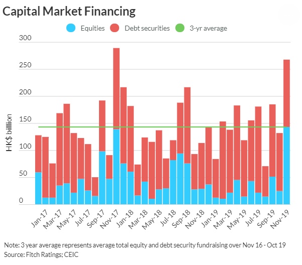 事实上,香港2019年的股权融资和债权融资规模仍与过去三年的平均水平保持大体一致。而且银行系统存款(港元和外币)、公司注册及就业签证数据显示,香港作为全球商业中心的地位并未受到明显削弱。