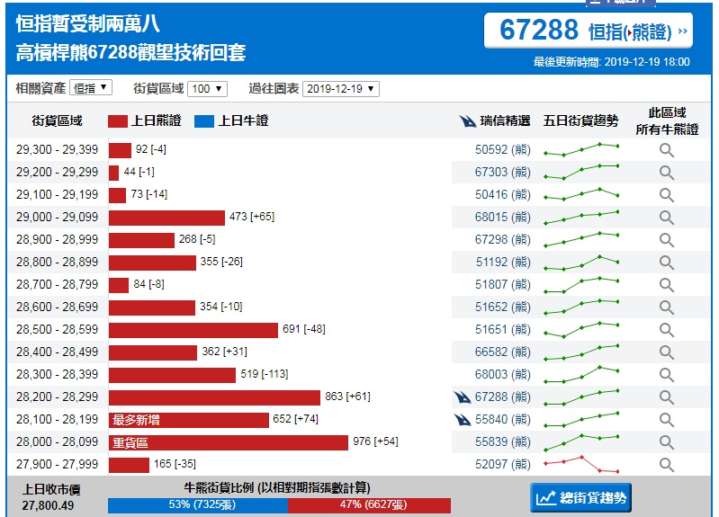 智通财经APP获悉,截至12月19日,恒指最新的牛熊街货比例53:47。瑞信恒指牛熊证街货分布图中的数据显示,熊证街货重货区在28000-28099区间,该区间最新熊证数量为976张,较上一交易日增加54张,最多新增在28200-28299区间,该区间最新熊证数量为652张,较上一交易日增加74张。牛证街货重货区在26400-26499区间,该区间最新牛证数量为769张,较上一交易日减少160张,最多新增在26900-26999区间,该区间最新牛证数量为549张,较上一交易日增加549张。
