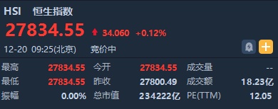 智通财经APP获悉,恒生指数开盘涨34.06点或0.12%,报27834.55点。国企指数跌0.02%,报10983.51点。红筹指数涨0.08%,报4417.89点。大市盘前成交18.23亿港元。