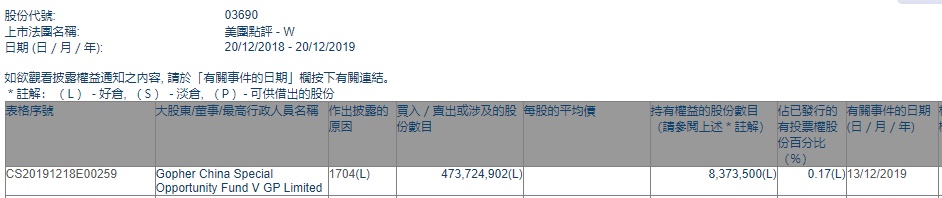 智通财经APP获悉,上周五(12月13日),据联交所权益披露资料显示,美团点评(03690)遭主要股东红杉资本中国基金旗下创业金 SCC Growth IV 2017-D,L.P 悉售约4.82亿股美团 B 类股份,未有披露具体作价。紧接出售相关股份后,红杉资本持股由9.51%降至0。