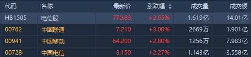 截至发稿,中国联通(00762)涨3%,报7.21港元;中国移动涨2.72%,报64.15港元;中国电信(00728)涨2.27%,报3.15港元。
