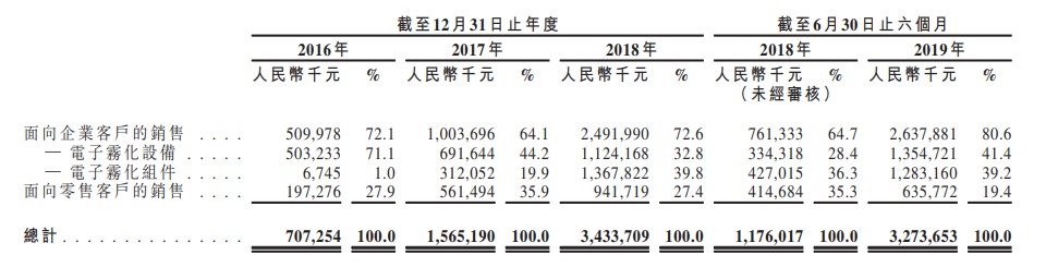 就收益构成而言 , 于2016年 、2017年及2018年以及截至2019年前6个月, 面 向 企 业 客 户 销 售 产 生 的 收 益 分 别 达 72.1% 、64.1% 、72.6%及80.6% 。 另一方面 ,2016年 、2017年及2018年以及2019年前六个月 , 面向零售客户销售产生的收益分别达27.9%、35.9%、27.4%及19.4%。