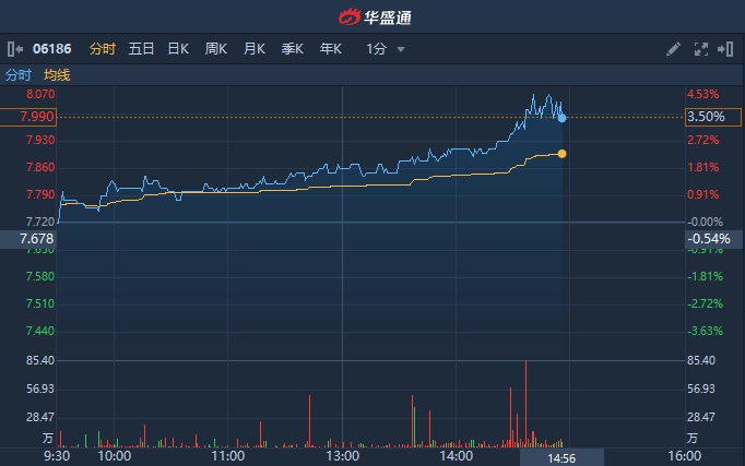 智通财经APP获悉,次新股中国飞鹤(06186)午后获资金青睐,股价持续上行,盘中高见8.05港元,刷新上市新高,截至发稿,涨3.5%,报7.99港元,成交额7344.23万港元。