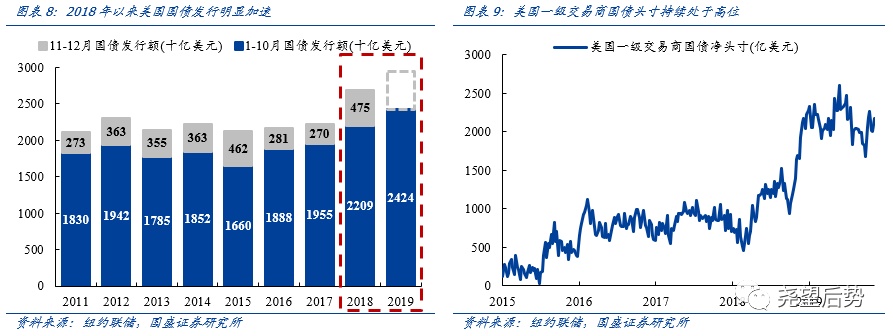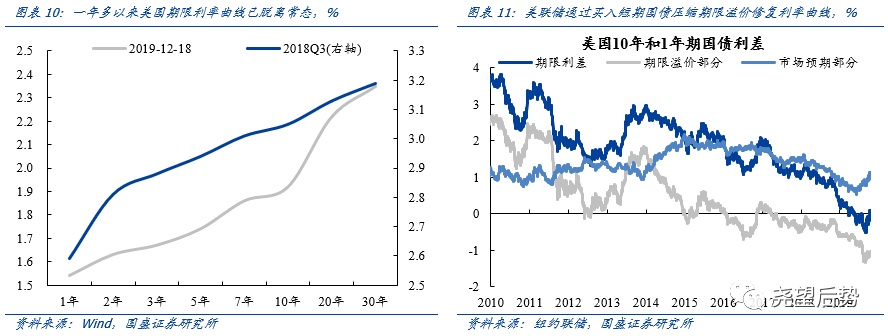 而货币宽松的好处也是显而易见的:一方面,补充货币市场流动性。财政抢跑之下,2018年以来美国国债发行明显加速,导致一级交易商因承接国债而出现资金短缺。在财政政策仍在持续扩张托底经济的情况下,市场已亟需补充流动性。另一方面,修复期限利率曲线,促进长期投资。近一年来美国长短期利率倒挂不断加深,不利于长期投资。美联储通过买入短期国债压缩期限溢价,以达成修复期限利率曲线的目的。