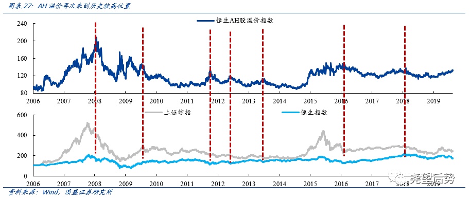AH溢价收敛有望带动估值修复。19年以来,AH溢价再度走高并来到历史较高水平。回顾历史,AH溢价水平的走高,大多数情况下都来自A股相对于港股的超涨,而回落时也大多是由于A股的大幅下跌。然而本轮AH溢价变化有所不同,尽管AH溢价最初的提升同样时因为年初A股的大幅上涨,但最终推动AH溢价水平持续走阔的,很大程度上要归因于同期H股相对A股的超跌。对比来看的话,当前较为类似2015年下半年:港股在全球波动等影响下相对A股显著超跌,16年当这些因素逐步缓和后,港股也迎来一波强力复苏。未来,随着内外部不确定性逐渐缓解,港股也有望盈利一波估值修复。