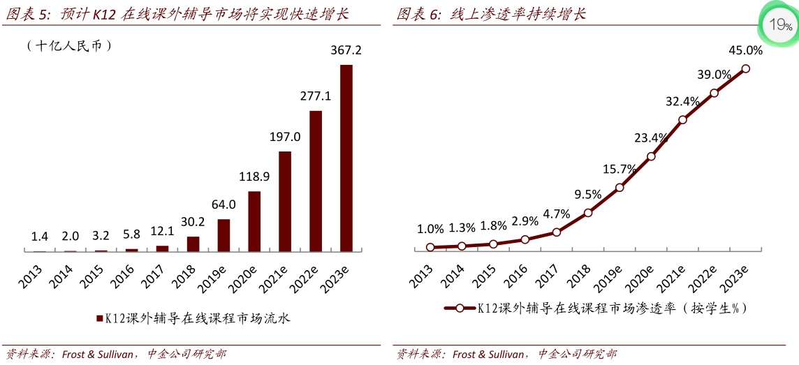 ►中国在线教育市场蓬勃发展。根据Frost&Sullivan数据,K12在线大班课市场整体流水规模到2023年有望达到2000亿元人民币。我们认为,在线教育渗透率大幅提升主要得益于:1)教学技术提升改善了在线教育的学习体验;2)与线下教育相比,在线教育定价更具有吸引力。