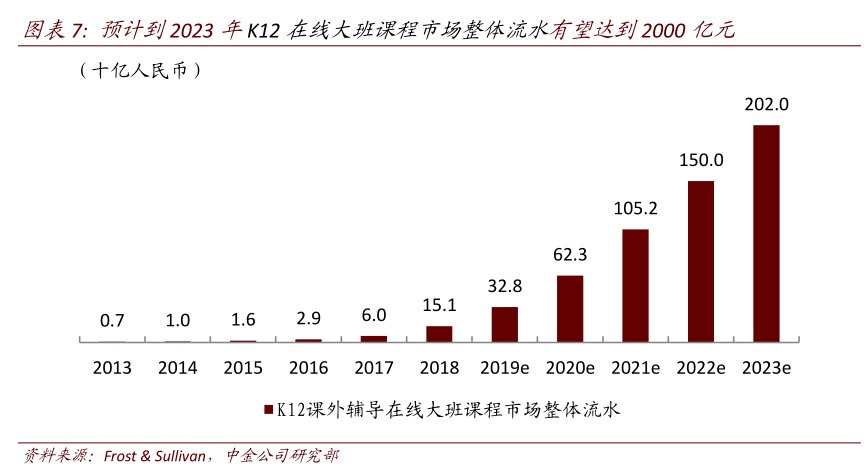 其中,K12在线大班课业务增长强劲,主要由于与一对一模式相比,大班模式在学生的学习体验与辅导机构的经济效益之间实现了较好的平衡。根据Frost&Sullivan数据,预计2023年K12课外辅导在线大班课程市场整体流水有望从2018年的约150亿元人民币大幅提升至约2000亿元人民币。