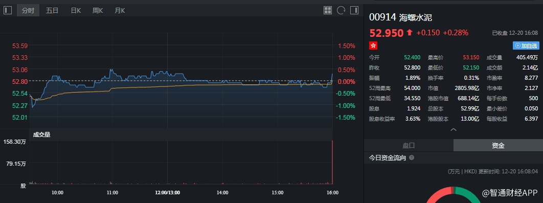 截至今日收盘,海螺水泥(00914)涨0.28%,报52.95港元。