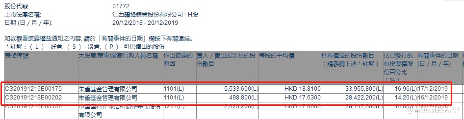 智通财经APP获悉,联交所最新资料显示,12月16-17日,朱雀基金分别增持赣锋锂业(01772)49.88万、553.36万股,每股作价分别为17.63港元及18.81港元,总金额约为1.13亿港元。增持后最新持股数目约为3395.58万股,最新持股比例为16.96%。