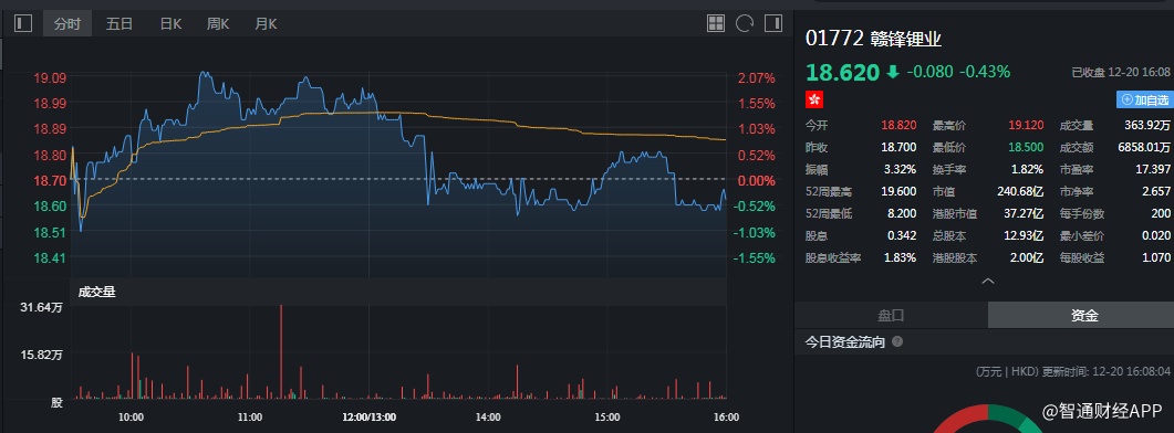 截至今日收盘,赣锋锂业(01772)跌0.43%,报18.62港元。